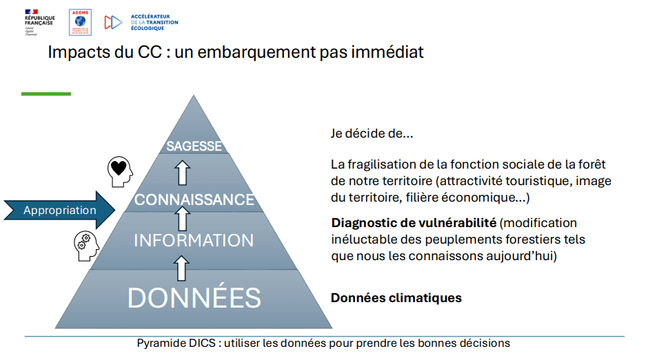 A retenir : On ne s’approprie pas des données (les résultats d’un diagnostic de vulnérabilité par exemple) en le lisant, par simple transfert d’informations. Il faut se poser soi-même des questions pour en faire des connaissances : se projeter dans des situations futures, associer des savoirs et donc embarquer ceux qui les portent, comprendre avec qui l’on partagera une même expérience des impacts.